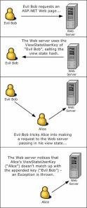 What the ViewStateUserKey property protects against is the case where a nefarious user visits a page, gathers the view state, and then entices a user to visit the same page, passing in their view state (see Figure 10). For more information on this property and its application, refer to Building Secure ASP.NET Pages and Controls.